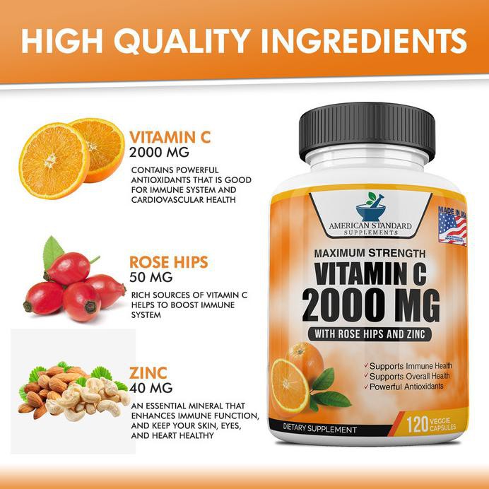 Amazon Com Vitamin C 2000mg With Zinc 40mg Per Serving And Rose Hips Extract Immune Support For Adults Immune Booster Vegan Non Gmo No Filler No Stearate 120 Vegan Capsules 60 Day Supply